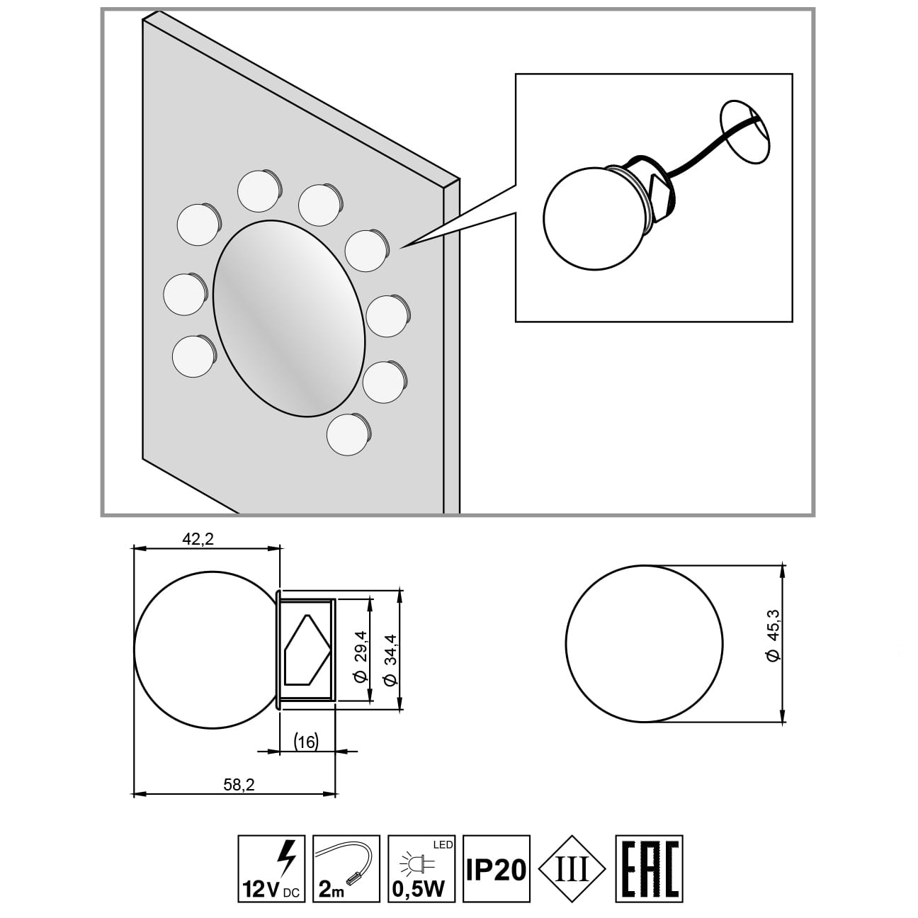 Lampki są przeznaczone do montażu wpuszczanego w płytę meblową. Wymagany otwór montażowy to precyzyjne fi 30mm. Dzięki temu oprawa idealnie licuje się z powierzchnią toaletki lub szafki.